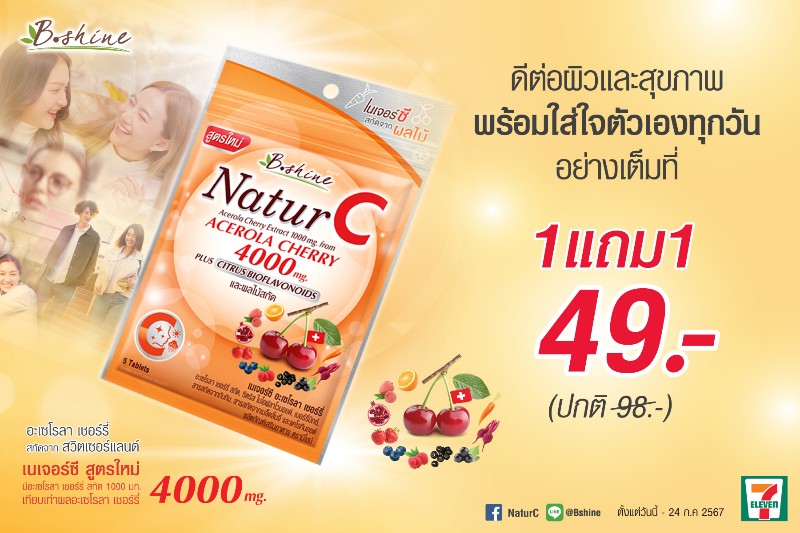 “บีไชน์ เนเจอร์ซี สูตรใหม่” แบบซองพกพาสะดวก ขนาด 5 เม็ด และแถมฟรีอีก 1 เม็ด จัดโปรโมชั่นลดสุดคุ้ม รับฝนหน้า ซื้อ 1 แถม 1 เพียง 49 บาท จากปกติ ราคา 98 บาท และหากใครเป็นสมาชิก ALL member รับเพิ่ม 100 คะแนน ซื้อได้ตั้งแต่วันนี้ – 23 กรกฎาคม 2567 ที่ร้านเซเว่น อีเลฟเว่น ทุกสาขาทั่วประเทศ สามารถดูข้อมูลเพิ่มเติมได้ที่ www.bshine.co.th, FB : https://www.facebook.com/BnpHealth และ Line : @Bshine