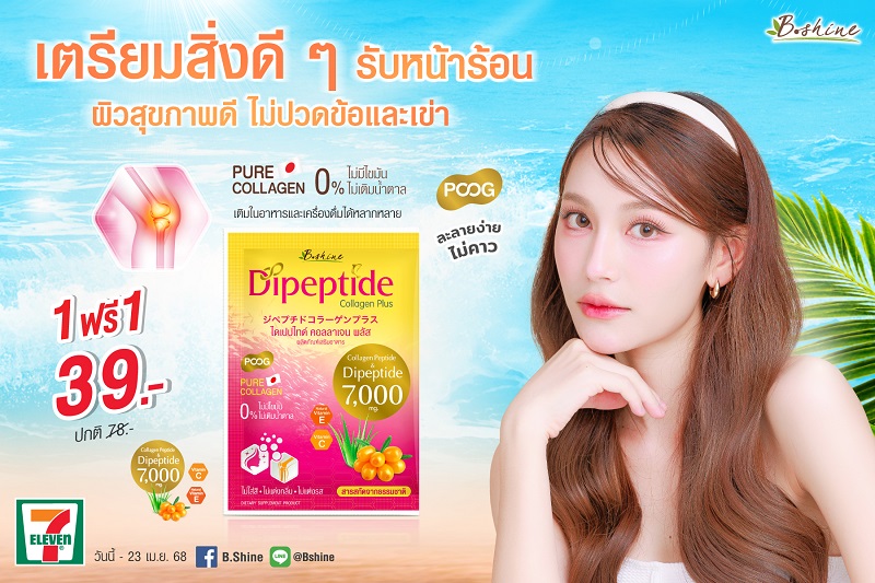 ซัมเมอร์ เมษานี้ บริษัท บีไชน์ นูทริชั่น พลัส จำกัด จัดโปรโมชั่นสุดคุ้มเพื่อสาวๆ “บีไชน์ ไดเปปไทด์ คอลลาเจน พลัส” ขนาดซองบรรจุ 7,200 มิลลิกรัม เข้มข้นด้วยสารสกัดที่จะช่วยดูแลผิวและข้อเข่า ซื้อ 1 ซอง ฟรีอีก 1 ซอง พิเศษเพียง 39 บาท จากปกติราคา 78 บาท และสมาชิก All Member รับ 1 เหรียญ สามารถซื้อได้ตั้งแต่วันนี้ – 23 เมษายน 2568 ที่ร้านเซเว่น อีเลฟเว่น ใกล้บ้าน เป็นคอลลาเจน เกรดพรีเมี่ยม อีกหนึ่งผลิตภัณฑ์ที่ขายดีและรับประกันคุณภาพจากบีไชน์ อยากให้ทุกคนได้ลองทาน ไม่มีสารตกค้างในร่างกาย