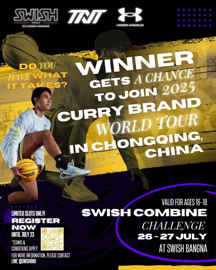 เนื่องในโอกาสต้อนรับการมาเยือนของ Curry Brand World Tour สู่ภูมิภาคเอเชีย Under Armour จับมือกับ SWISH จัดกิจกรรม “Swish Combine Challenge Presented by Under Armour” เปิดเวทีให้เยาวชนไทยได้มีโอกาสพัฒนาฝีมือสู่ระดับโลก สำหรับเยาวชนอายุระหว่าง 16–18 ปี เข้าร่วมทดสอบความสามารถใน 5 ทักษะหลักของบาสเกตบอล ด้านความเร็ว การกระโดด การเลี้ยงลูก การชู้ต และการส่งบอล เพื่อคัดเลือก 2 ผู้เล่นที่มีศักยภาพโดดเด่นที่เป็นตัวแทนประเทศไทยเข้าร่วม Curry Brand World Tour 2025 ณ เมืองฉงชิ่ง ประเทศจีน กิจกรรมจะจัดขึ้นระหว่างวันที่ 26–27 กรกฎาคม 2567 ณ SWISH Bangna โดยเปิดรับสมัครแล้ววันนี้จนถึงวันที่ 23 กรกฎาคม 2568